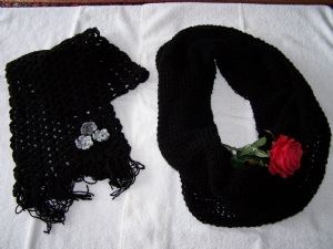 De linker sjaal is gehaakt en de rechter is een gebreide colsjaal